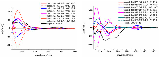Comparison of the experimental and calculated ECD spectra of 5 and 16.