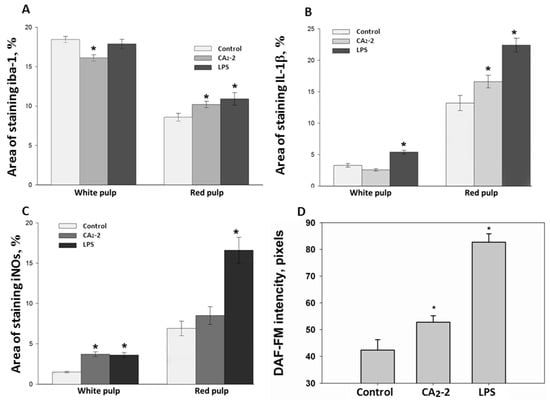 16]. We have shown that LPS causes a significant increase in iNOs, both in the red and white pulp of the spleen, which indicates the full launch of the inflammatory response. In the case of CA