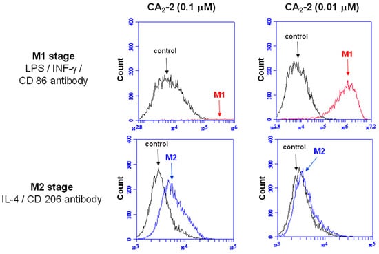RAW 264.7 murine macrophages cultured in DMEM supplemented with 10% FBS, 1% sodium pyruvate and 1% MEM nonessential amino acids at 37 °C under a humidified 5% CO2 atmosphere were co-incubated with different concentrations of CA2-2 (0.1 and 0.01 μM) and then subsequently by incubating with LPS (1 μg/mL) and IFN-γ (20 ng/mL) for 24 h at 37 °C for observing the change in M1 polarization. A similar procedure was done by replacing IFN-γ with IL-4 (20 ng/mL) for macrophages M2 polarization. Polarized macrophages were collected in microcentrifuge tubes (1 × 106 cells/tube), washed three times with PBS, and then resuspended in 1 mL PBS in FACS tube. Finally, the immunofluorescence of RAW 264.7 cells was identified by anti-CD 86 and anti-CD 206 antibodies (Abcam, Cambridge, MA, USA) with the FACScan flow cytometer (Becton-Dickinson, Franklin Lakes, NJ, USA).