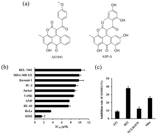 Cytotoxic effect of AS1041. (a) Chemical structure of AS1041 and aspergiolide A (ASP-A). (b) IC50 values of AS1041 on selected human cancer cells (K562, HeLa, HL-60, A549, CaSki, Jurkat, PC-3, Kasumi-1, MDA-MB-231, and BEL-7402). Cells were treated with AS1041 for 72 h. Cell viabilities were examined by the 3-(4,5-dimethylthiazol-2-yl)-2,5-diphenyltetrazolium bromide (MTT) or sulforhodamine B (SRB) assay. ** p < 0.01 vs. other cell lines. (c) Inhibition of AS1041 on 4T1, H22, NCI-H1975, and Siha cells. Cells were treated with AS1041 (10 μM) for 72 h. Cell viabilities were examined by MTT or SRB assay. Data are presented as mean ± SD for three independent experiments.