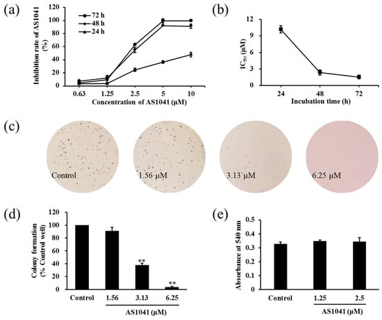 AS1041 inhibits K562 cells proliferation. (a) AS1041 inhibition rates (%) against K562 cells at different concentrations at 24, 48, and 72 h incubation. Cell viabilities were examined by the MTT assay. (b) IC50 values of AS1041 on K562 cells at 24, 48, and 72 h, respectively. (c) AS1041 inhibition on the formation of colonies in soft agarose. K562 cells were mixed in Dulbecco’s modified Eagle’s medium (DMEM) culture medium containing 0.35% agarose, in the absence or presence of different concentration of AS1041. Ten days later, the colonies were stained by crystal violet, then photos were taken, and numbered. (d) Quantification of the number of colonies in soft agarose. ** p < 0.01 vs. control. Data are presented as means ± SD from three independent experiments. (e) Effect of AS1041 on K562 cells differentiation. K562 cells were treated with indicated concentration of AS1041 for 72 h. Then, differentiation of K562 cells was measured by the nitroblue tetrazolium (NBT) reduction assay. Data are presented as mean ± SD for three independent experiments.