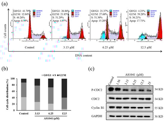 To explore the mechanisms underlying the cytotoxic activity of AS1041 in K562 cells, we detected the cell cycle distribution by flow cytometry, as in certain situations, induction of proliferation inhibition is a result of cycle arrest. As shown in Figure 3a, after AS1041 treatment, there was a decrease in the percentage of cells in G0/G1 phase and a significant increase in G2/M phase, in a concentration-dependent manner. The percentage of G2/M phase in the control group was 12.04%, and it increased to 21.85%, 27.60%, and 59.28%, when treated with 3.13, 6.25, and 12.5 μM AS1041, respectively (Figure 3b). Cyclin B1 and cell division cycle protein 2 (CDC2) are two key regulators of mitosis. Cyclin B1 associates with centrosomes and the mitotic spindle during mitosis, while CDC2 is a cell division cycle kinase and the activation of CyclinB1/CDC2 is generally considered to trigger the entry to mitosis [,]. Inhibiting CDC2 phosphorylation and downregulating Cyclin B1 usually lead to the cell cycle arrested at G2/M checkpoint [,]. After AS1041 treatment, the expression of Cyclin B1 decreased, and the activation of phospho-CDC2 (P-CDC2) decreased in a concentration-dependent manner (Figure 3c), confirming the G2/M phase arrest occurred after AS1041 treatment in K562 cells. These results indicated that AS1041 could arrest K562 cells at G2/M phase in a concentration-dependent manner. This was the same to other clinical chemotherapy agents, such as etoposide, which all inhibit the growth of cancer cells by inducing G2/M phase arrest [].