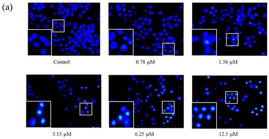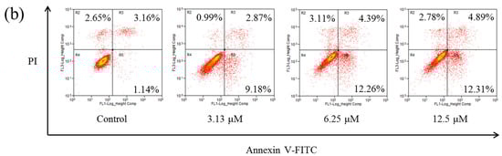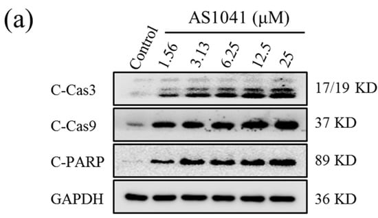 Cell cycle regulation analysis has been vastly used as an important parameter to indicate apoptosis by detecting the appearance of cells in sub-G0/G1. When we detected the cell cycle distribution of K562 cells, we also found that the sub-G0/G1 phase cells appeared in a concentration-dependent manner after AS1041 treatment (Figure 3a). The percentage of sub-G0/G1 cells in the control group was 0.59%, and it increased to 4.97%, 15.20%, and 17.71% after treatment with AS1041 (3.13–12.5 μM), respectively, indicating AS1041 also possibly induced cell apoptosis.