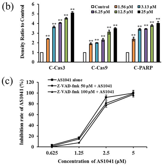 AS1041 triggers non-caspase-dependent apoptosis. (a) Effect of AS1041 on apoptosis-related proteins in K562 cells. K562 cells were treated with indicated concentration of AS1041 for 24 h, and then the cells were collected, washed, and lysed. Cleaved caspase-3 (C-Cas3), cleaved caspase-9 (C-Cas9), and cleaved Poly-adenosine diphosphate-ribose polymerase (C-PARP) were measured by Western blotting. (b) Histograms show the relative intensity of C-Cas3, C-Cas9, and C-PARP bands to control. Data are presented as mean ± SD for three independent experiments. ** p < 0.01 vs. control. (c) Pan-caspase inhibitor N-benzyloxycarbonyl-Val-Ala-Asp (OMe)-fluoromethylketone (Z-VAD-FMK) does not attenuate inhibition rate (%) of AS1041 on K562 cells. K562 cells were pre-treated with Z-VAD-FMK for 1 h, and then AS1041 for 72 h. K562 cells proliferation was measured by MTT assays. Data are presented as mean ± SD for three independent experiments.