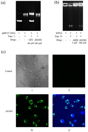 A total of 20 μL reaction containing 50 mM Tris, 120 mM KCl, 10 mM MgCl2, 0.5 mM ATP, 0.5 mM DTT, 30 μg/mL BSA, 200 ng kDNA, and 1 U Topo II was incubated with or without AS1041 at 37 °C for 30 min. ADM was used as a positive control. The reaction was terminated by adding 2 μL of DNA 10× loading buffer and subjected to electrophoresis in 1% agarose containing 1/10,000 GelRedTM Nucleic Acid Gel Stain. Gels were visualized by FluorChem E (Protein Simple, San Jose, CA, USA).