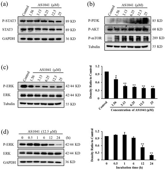 AS1041 inhibits the activation of ERK. (a) Effect of AS1041 on P-STAT3 pathways. K562 cells were treated with indicated concentration of AS1041 for 24 h. The protein levels of P-STAT3 and STAT3 were detected by Western blotting. (b) Activation of PI3K/AKT/mTOR pathway after treatment of AS1041. K562 cells were treated with indicated concentration of AS1041 for 24 h. The protein levels were detected by Western blotting. (c,d) P-ERK inactivation by AS1041 in K562 cells. K562 cells were treated with indicated concentration of AS1041 (c) or indicated time (d), protein levels were detected by Western blotting. Histograms show the relative intensity of P-ERK bands. Data are presented as mean ± SD for three independent experiments. * p < 0.05, ** p < 0.01 vs. control.