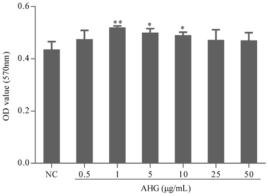 The absorbance at 570 nm (A570) measured by 3-(4,5-dimethylthiazol-2-yl)-2,5-diphenyltetrazolium bromide (MTT) assay can reflect the splenocytes viability. The A570 values of AHG groups did not decrease compared with those of normal control (NC) group (Figure 1). It was suggested that AHG at 0.5–50 μg/mL had no toxic effect on mouse splenocytes. On the contrary, AHG at 1–10 μg/mL significantly increased the amount of splenocytes, which indicated that treatment of AHG at low concentration could promote splenocytes proliferation responses.
