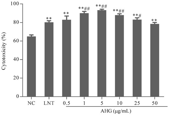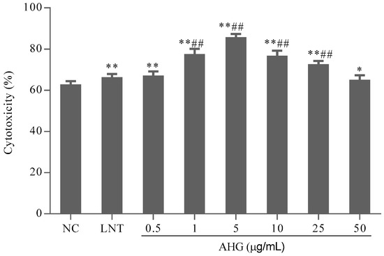 To evaluate the effect of AHG on tumor cell elimination mediated by NK cells, the cytotoxicity of splenocytes against NK cells-sensitive YAC-1 lymphoma cells was investigated. As shown in Figure 2, compared with the NC group, the treatment with AHG (0.5–50 μg/mL) enhanced NK cells cytotoxicity significantly (p < 0.01). The maximum effective concentration was 5 μg/mL. The cytotoxicity of NK cells in AHG groups with the concentration ranged from 1 to 25 μg/mL were higher than that in LNT (40 μg/mL) group (p < 0.05). These results indicated that AHG strengthened the activity of NK cell against tumor cells.