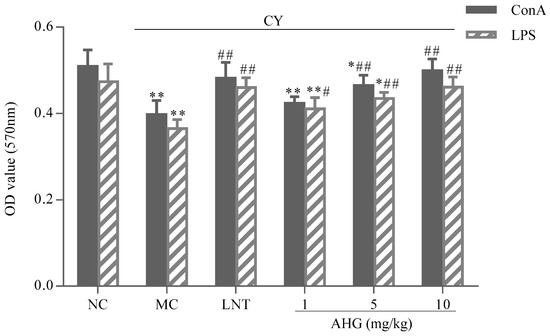 Effect of AHG on mitogen-induced splenic lymphocytes proliferation in CY-treated mice (n = 8). Compared with the NC group * p < 0.05, ** p < 0.01; compared with the LNT group # p < 0.05, ## p < 0.01.