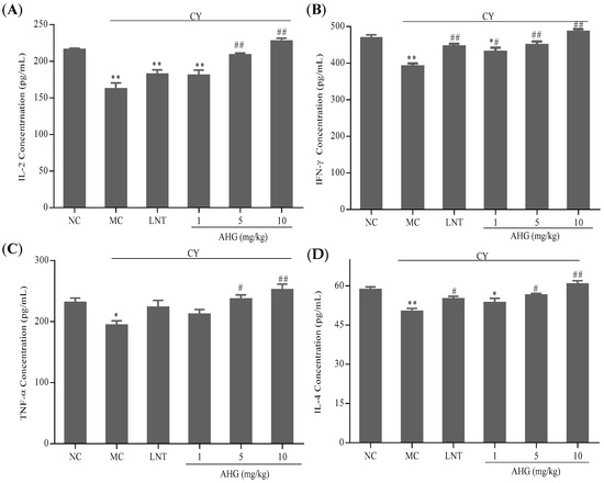 Effects of AHG on cytokines secretion of splenocytes from CY-treated mice (n = 8): (A) IL-2; (B) IFN-γ; (C) TNF-α; and (D) IL-4. Compared with the NC group * p < 0.05, ** p < 0.01; compared with the LNT group # p < 0.05, ## p < 0.01.