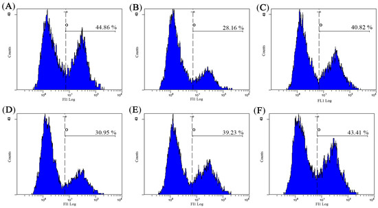 Effect of AHG on intracellular free Ca2+ concentration in spleen lymphocytes of CY-induced mice (n = 8): (A) NC group; (B) MC group; (C) LNT group; (D) AHG group at 1 mg/kg; (E) AHG group at 5 mg/kg; and (F) AHG group at 10 mg/kg.