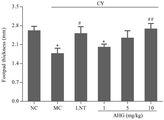 The effect of the AHG treatments on the DTH reaction to sheep red blood cells (SRBC) in mice was displayed in Figure 7. The footpad thickness of mice in MC group was markedly lower than that in NC group (p < 0.05). AHG treatment exhibited an enhancement on footpad edema volume in CY-treated mice. Significant change was observed at the highest dose of AHG (10 mg/kg, p < 0.01). Thus, it was suggested that AHG strengthened the T-cell-mediated immune response in mice.