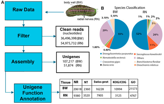 Figure 1. Overall strategy and outcome of transcriptome sequencing, data analysis and annotation of Holothuria scabra body wall (BW) and radial nerve (RN). (A) Workflow for analysis, including unigene and annotation outcome. NR, protein database; NT, nucleotide database; Swiss-Prot, curated protein sequence database; GO, gene ontology; KOG, Eukaryotic Orthologous Groups ontology. (B) Pie charts showing NR protein database matches.