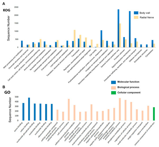 Figure 2. Histograms for KOG and GO functional annotation of Holothuria scabra. (A) Histogram showing KOG functional annotation of H. scabra body wall and radial nerve genes; (B) GO term classifications for those genes represented in the KOG ‘signal transduction mechanisms’ of H. scabra body wall. Division of Molecular, Biological and Cellular categories are shown in GO.