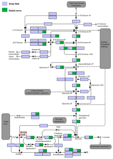 Figure 3. Biosynthetic routes of glycolysis cycle showing genes annotated from Holothuria scabra body wall and radial nerve transcriptomes. Violet squares represent genes detected in the body wall transcriptome, while green squares represent genes detected in the radial nerve transcriptome. All energy producing cycles, including starch and sucrose metabolism, pyruvate metabolism and propanoate metabolism, pentose phosphate pathway, carbon fixation and citric cycle are marked as grey (modified from KEGG Pathway Database). Location of Acetyl-CoA is highlighted by a red box.