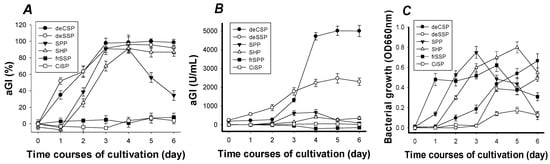 The results of maximum aGI activity, aGI productivity, and cell growth were investigated, and are shown in Figure 1. After four days of fermentation, the maximum aGI activity (Figure 1A) of most C/N sources reached the highest level, 91–100% with the priority sequence of deCSP, deSSP, SHP, and SPP. The maximum aGI activities of deCSP, deSSP, and SHP remained thereafter; only SPP decreased dramatically to a level lower than 40% on the 6th day. The reason might be related to the higher content (around 60%) of protein in SPP. It is also possible that an additional inhibitory component was made and accumulated with increased time that affected the activity of the active compound. The other possibility could be the decreased stability of the active ingredient in SPP after the fourth day. A similar phenomenon was also found in Bacillus subtilis TKU007, which showed that SHP was a better C/N source than SSP for the production of chitosanase and protease [] and nattokinase []. Although the protein content of SPP was higher than that of SSP, the resultant enzyme productivity was not raised []. This might be related to the ratio of chitin and protein in the C/N sources.