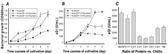 To examine the relationship of aGI productivity and bacterial growth, the culture broth after removing the residual chitinous materials (C/N source) by centrifugation (Kubota 5922, Japan) at 150× g for 10 min was used for analyzing cell growth. As shown in Figure 1C, deCSP and deSSP were not the best C/N sources for cell growth. These results showed that the production of aGI may not have a direct relationship with cell growth.