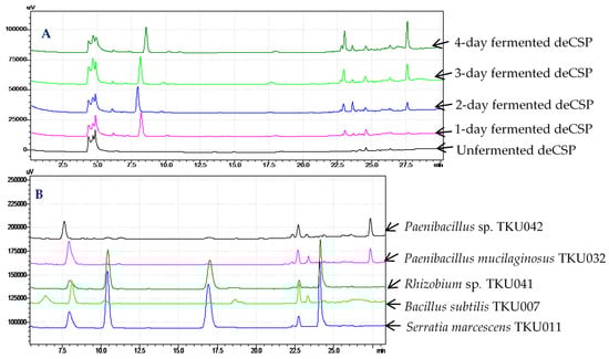 To further compare which peaks especially belong to Paenibacillus sp., the four day-fermented deCSP by Paenibacillus sp. TKU042, Paenibacillus mucilaginosus TKU032, Rhizobium sp. TKU041, B. subtilis TKU007, and Serratia marcescens TKU011 were analyzed. As shown in Figure 3B, only the peak at the retention time of 27.5 min was found in deCSP fermented by Paenibacillus sp. TKU042 and P. mucilaginosus TKU032. Combining these results with the data shown in Table 2, this peak may signify the active compounds of aGI. The isolation and identification of these aGI will be performed soon.