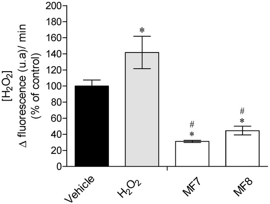 Results reveal that fractions MF7 and MF8 induced significant differences in the real time H2O2 production (Figure 2), decreasing the H2O2 production in about 70 and 56%, respectively, regarding the vehicle situation (basal H2O2 production), and about 78 and 68.5%, respectively, comparing to the H2O2 situation.