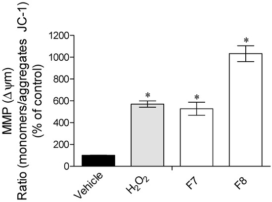 The H2O2 treatment promoted a mitochondrial membrane depolarization (Figure 3). The presence of the seaweed fractions did not reduce the depolarization induced by H2O2. Additionally, fraction MF8 seemed to potentiate the H2O2 effects.