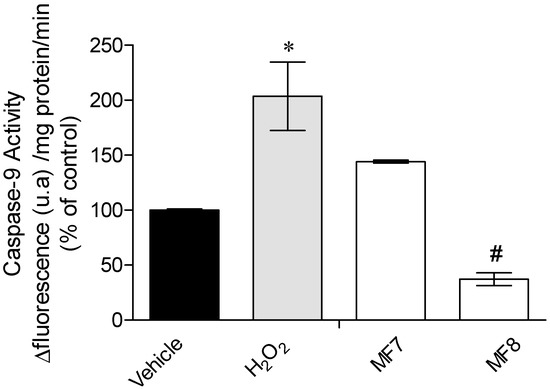 Concerning the effects of H2O2 in the mitochondrial membrane potential (ΔΨm), it can be observed that this induced a noticeable membrane depolarization (Figure 3). The mitochondrial membrane potential is essential to maintain the physiological function of the respiratory chain, and therefore changes on ΔΨm can promote cell death since it is involved in early apoptotic signaling pathways [28,29]. In the presence of MF7 fraction, the depolarization induced by H2O2 was maintained, but the MF8 fraction seemed to increase the H2O2 effects by increasing membrane polarization. These results suggest that the protective effects of these fractions are not directly associated to the mitochondrial membrane’s potential. Other possibility for the observed results was the involvement of the compounds in apoptotic mechanisms, and therefore, to deepen the protective effects of these fractions, the Caspase-9 activity was also assessed. Caspase-9 is one of the downstream regulators of apoptosis being associated to oxidative stress pathways [39]. Although the increase of ΔΨm is associated with the activation of caspases cascade, MF8 induced a marked reduction of more than 80% of Caspase-9 activity (Figure 4). Similarly, Chia and co-workers [40] evaluated the ability of seaweed to reduce cytotoxicity on MCF-7 cells and verified that Turbinaria ornate (also belonging to the Fucales order) also reduced Caspase-9 activity. Leeand co-workers [41] also showed that seaweed phlorotannins promoted cellular protection of HepG-2 cells by reducing Caspase-3 activity.