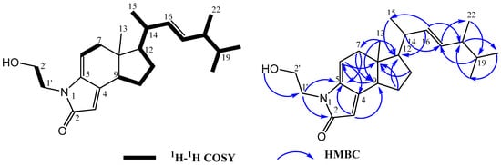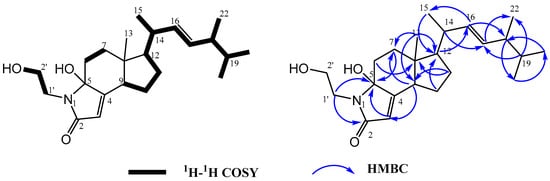 The H-H COSY spectrum of 1 gave several spin systems which belong to substructures as shown in Figure 2 with bold lines. The HMBC correlations from a sp2methine proton at δH 5.27 (1H, dd, H-16) to carbons at δC 21.5 (C-15, 3J) and 43.8 (C-18, 3J), and from a sp2methine proton at δH 5.30 (1H, dd, H-17) to carbon at δC 41.1 (C-14, 3J), confirmed the presence of a characteristic side chain of ergosterol []. A methyl proton at δH 0.71 (3H, s, Me-13) displayed four HMBC correlations to carbons at δC 40.8 (C-7, 3J), 47.7 (C-8, 2J), 49.4 (C-9, 3J) and 55.6 (C-12, 3J), interpreted as direct attachment to the quaternary C-8. The HMBC correlations from the proton at δH 1.93 (1H, m, H-10) to carbons at δC 47.7 (C-8, 3J) and 55.6 (C-12, 3J), from the proton at δH 5.60 (1H, m, H-6) to carbons at δC 47.7 (C-8, 3J) and 152.0 (C-4, 3J), from protons at δH 2.63 (2H, m, H-7)/2.34 (dd, 2.5, 17.5) to carbons at δC 141.5 (C-5, 3J), 49.4 (C-9, 3J) and 55.6 (C-12, 3J), confirmed the substructure of the B ring and C ring of ergosterol. The HMBC correlations from the proton at δH 5.63 (1H, br.s, H-3) to carbons at δC 171.1 (C-2, 2J), 141.5 (C-5, 3J) and 49.4 (C-9, 3J), from protons at δH 3.64 (2H, m, H-1′) to carbons at 171.1 (C-2, 3J) and 141.5 (C-5, 3J), and from protons at δH 3.63 (2H, m, H-2′) to carbon at δH 171.1 (C-2, 4J), confirmed the presence of an α,β-unsaturated γ-lactam and two methylene carbons linked to γ-lactam and the hydroxyl group.