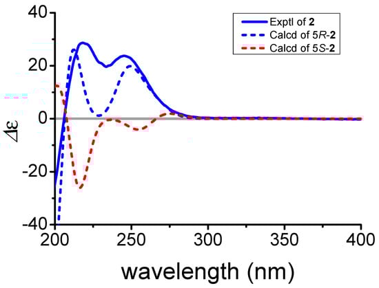 ECD calculations of Anandium B (2): The systematic random conformational analysis of two possible stereoisomers (5R and 5S) of 2 was performed in the SYBYL 8.1 program by using a MMFF94s molecular force field, which afforded 40 and 42 conformers for 5R and 5S respectively, with an energy cutoff of 10 kcal mol−1 to the global minima. All the obtained conformers were further optimized using DFT at the B3LYP/6-31+G (d) level in gas phase by using Gaussian09 software (Gaussian, Inc., Wallingford, CT, USA), and eight conformers of each stereoisomer were selected. All of the optimized stable conformers were used for TDDFT (cam-B3LYP/6-31+G (d)) computation of the excited states at the same levels, with consideration of the first 50 excitations. The overall ECD curves were weighted by the Boltzmann distribution of each conformer (with a half-band width of 0.25 eV), with a UV correction of 10 nm. The calculated ECD spectra of 5R and 5S of 2 were subsequently compared with the experimental spectra, respectively. The ECD spectra were produced by SpecDis 1.6 software (T. Bruhn, Y. Hemberger, A. Schaumlöffel, G. Bringmann, SpecDis version 1.6, University of Wuerzburg, Wuerzburg, Germany).