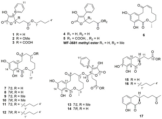 The EtOAc (ethyl acetate) extract of the fungus when fermented on solid rice medium yielded three new butenolides (1–3), seven new resorcylide derivatives (6–12), two new butenolide-resorcylide dimers (13 and 14) and two new dihydroisocoumarins (15 and 16) as well as three known analogues (4, 5 and 17) (Figure 1). The structure elucidation including the absolute configuration assignment and biological activities of the isolated compounds are discussed in this report.