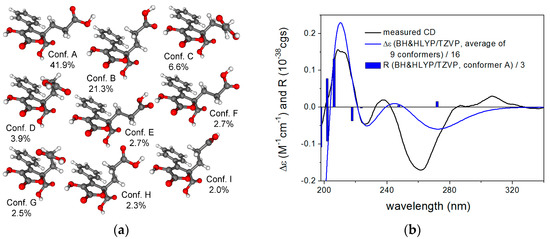 (a) structures and populations of the low-energy B3LYP/6-31G(d) in vacuo conformers (≥2%) of (R)-5; (b) experimental ECD spectrum of 5 in MeCN compared with the Boltzmann-weighted BH&HLYP/TZVP ECD spectrum of (R)-5 computed for the B3LYP/6-31G(d) in vacuo conformers. Bars represent the rotational strength values of the lowest-energy conformer.