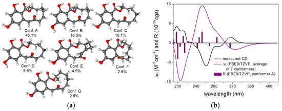 To elucidate the absolute configuration of the known natural product 5, the solution TDDFT-ECD (Time-Dependent Density Functional Theory-Electronic Circular Dichroism) protocol was applied on the arbitrarily chosen (R) enantiomer [15,16]. Merck Molecular Force Field (MMFF) conformational search with an implicit solvent model for CHCl3 resulted in 149 conformers in a 21 kJ/mol energy window. DFT reoptimization of these yielded 9, 12 and 12 low-energy (≥2%) conformers at the B3LYP/6-31G(d) in vacuo, the B97D/TZVP PCM (Polarizable Continuum Model)/MeCN and the CAM-B3LYP/TZVP PCM/MeCN levels, respectively. Boltzmann-averaged ECD spectra of (R)-5 resembled the experimental ECD spectrum allowing elucidation of the absolute configuration as (R) (Figure 2).