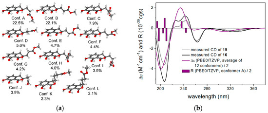 (a) structures and populations of the low-energy CAM-B3LYP/TZVP PCM/MeCN conformers (≥2%) of the truncated model compound of (R)-16; (b) experimental ECD spectra of 15 and 16 in MeCN compared with the Boltzmann-weighted PBE0/TZVP PCM/MeCN ECD spectrum of the truncated model compound of (R)-16 computed for the CAM-B3LYP/TZVP PCM/MeCN conformers. Bars represent the rotational strength values of the lowest-energy conformer.