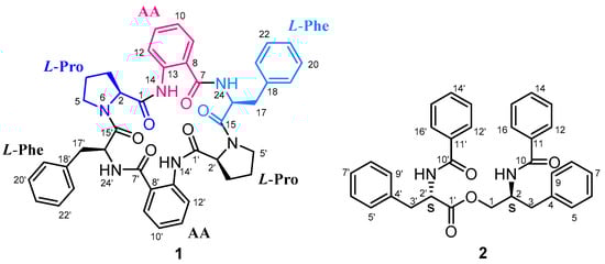 The absolute configurations of the amino acids in 1 were determined by UPLC-MS analysis of the acid hydrolysate derivatized with Marfey’s reagent (Nα-(2,4-dinitro-5-fluorophenyl)-l-alalinamide, l-FDAA) [21]. The retention times and negative ESIMS indicated the presence of l-Pro and l-Phe in 1 (see Experimental and Figure S16). Thus, the absolute configuration of 1 was determined as shown in Figure 1. These structural features revealed that aspersymmetide A (1) is a centrally symmetric cyclohexapeptide.
