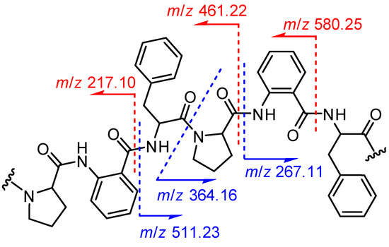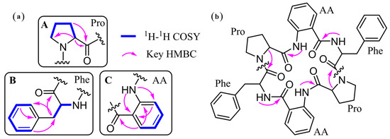 Detailed analysis of 1D and 2D NMR data led to the identification of three units including a proline (Pro.), a phenylalanine (Phe.), and an anthranilic acid (AA) (Figure 2a). However, these three units only were attributed to be half of the proposed molecular formula. It suggested that 1 should be a symmetrical dimer. The HMBC correlations were used to connect the residues in 1. The correlations [Phe-NH→AA-CO] and [AA-NH→Pro-CO] revealed the half sequence of CO-Phe-NH→CO-AA-NH→CO-Pro-N (Figure 2). The [Pro-α-H→Phe-CO] connected the two half sequences to establish the whole cyclic structure, cyclo-[CO-Phe–AA–Pro–Phe–AA–Pro-N]. Additional evidence confirmed the structure of 1 on the basis of the ESI MS2 experiments with neutral losses (Figure 3 and Figure S14). Thus, the planar structure of 1 was determined as shown in Figure 2b.