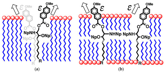 The orientations of the electronic transition dipole moments ε of the arenoyl groups (Figure 4; only the primary O-Np groups are shown) within a monomer and between monomers are not known; indeed, this is a complex problem. Nevertheless, first order ensembles (considering only pairs) are likely offset in a manner reminiscent of conjugated monomeric molecules in other H-aggregates [35]. Although the bilayer is considered a “fluid mosaic”, closeness of spacing of paired monomeric chromophores (e.g., close packed form, Figure 4a) should influence the degree of delocalization of excitons. Further refinement of this model, beyond that implied in a simplified pair-wise interaction depicted in Figure 4, is wanting, but beyond the scope of this paper.