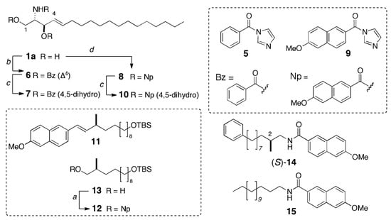 For the purposes of this study, model compounds containing benzoyl or 6-methoxy-2-naphthoyl chromophores (herein, abbreviated Np) were prepared (Scheme 1) for measurements of CD spectra under two sets of conditions: isotropic media (MeOH) or liposomal formulations (L-CD, liposomes 18:0), as previously described [30], where the DPPC or DSPC [31] bilayers comprise an anisotropic medium [32,33]. Natural d-sphingosine (1a) was converted (N-benzoylimidazole (5), DBU, CH3CN, 70 °C) to the corresponding perbenzoate (6) which was subsequently hydrogenated (H2, 1 atm, 10% Pd-C, EtOAc, 23 °C) to give N,O,O′-tribenzoylsphinganine (7) [16]. A parallel sequence of reactions gave pernaphthoyl derivative, 8, by acylation of 1a (N-Np-imidazole, 9, DBU, CH3CN, 60 °C), which was subsequently hydrogenated under the above conditions to give the pernaphthoyl sphinganine 10. For purposes of comparison, the long-chain 2-vinylnaphthalene 11 and the simple primary Np ester 12, prepared from the known long-chain primary alcohol 13 [7], were also secured.