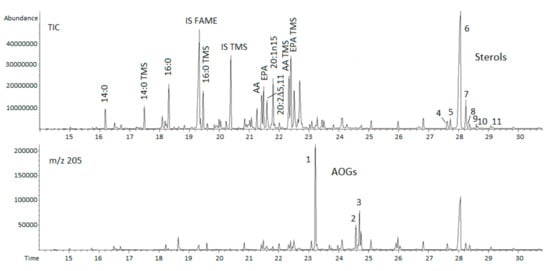 GC-MS analysis of transesterified and trimethylsilylated (TMS) fatty acids from ethanolic extract of BW lipids of sea urchin. Total ion (TIC) and extracted ion chromatogram (m/z 205) shows TMS derivatives of alkylglycerols (AOG; (1) 16:0-AOG, (2) 18:1-AOG, and (3) 18:0-AOG) and sterols (peaks 4–11, TIC): (4–5) unidentified sterols, (6) cholesterol, (7) desmosterol, (8) cholecalciferol as shoulder, (9) campesterol, (10) stigmasterol, and (11) clionasterol. Heptadecanoic acid (as FAME and TMS derivative) was used as internal standard (IS). Other peaks represent FAMEs and TMS ethers.