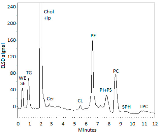 The UPLC-ELSD analyses from the ethanol extract of BW lipids, shown in Figure 2 and Table 3, demonstrate high abundance of phospholipids (PL, 80%), especially those of phosphatidylcholine (PC, 60 μg/mg) and phosphatidylethanolamine (PE, 40 μg/mg). The proportion of neutral lipids remained less than 20%. It is clear that ethanol extracts polar PLs better than neutral lipids (NL) like triacylglycerols and cholesteryl esters. The fatty acid profile with relatively high content of PUFAs indicates that the fatty acids have mostly originated from PLs. Lysophosphatidylcholine (LPC) eluted late as a broad peak and covered about 8% of total lipids.