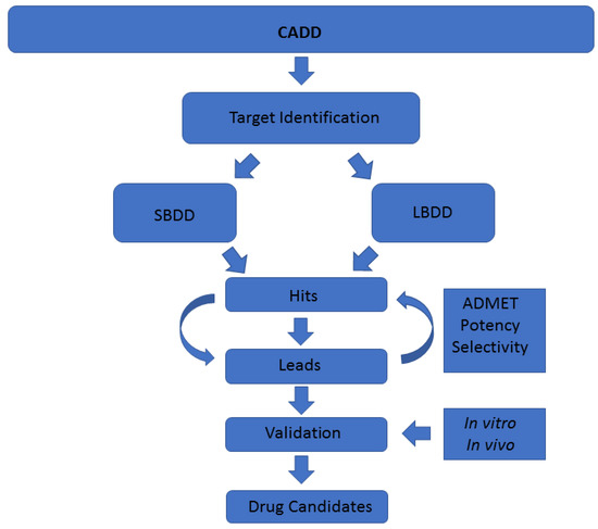 Schematic representation of the computer-aided drug discovery/design (CADD) techniques depicting a drug discovery pipeline.