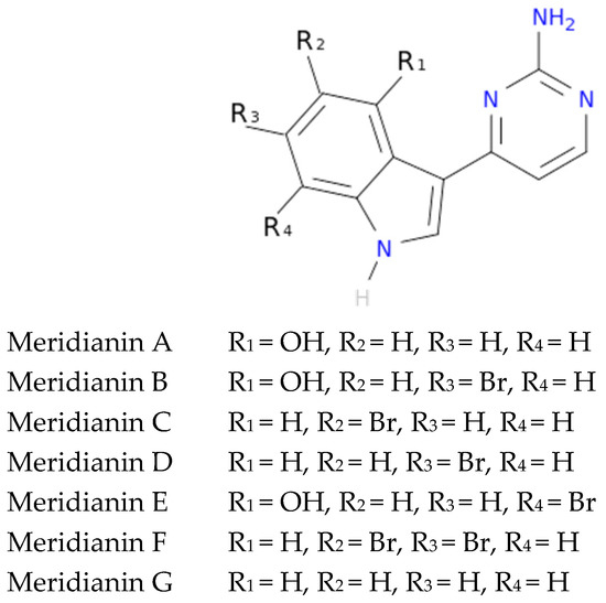 - Bharate, S.B.; Yadav, R.R.; Battula, S.; Vishwakarma, R.A. Meridianins: Marine-Derived Potent Kinase Inhibitors. Mini-Rev. Med. Chem. 2012, 12, 618–631. [Google Scholar] [CrossRef] [PubMed]