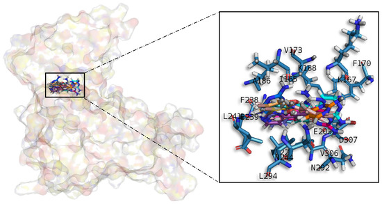 Meridianins A–G superposition over DYRK1A. Labelled ligand-active site amino acid residues involved in binding and the binding position of each meridianin model are enlarged.