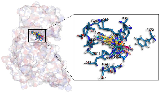 Meridianin A–G conformations against CLK1 differ by pose, as can be observed in the superimposition shown below (Figure 8). In fact, over this target is where meridianins displayed a more different conformation between the family members. In general, all poses tend to be located near the glycine rich loop and the hydrophobic pocket, interacting with the adenine motif FELL through L244 by a hydrogen bond interaction. The different poses were well stabilized into the hinge catalytic pocket by establishing hydrogen bonds interactions with L167 and L244 and hydrophobic contacts with L167, V175, A189, L244 and L295, all of them previously identified as binders, a fact that underline their inhibitory nature against CLK1.
