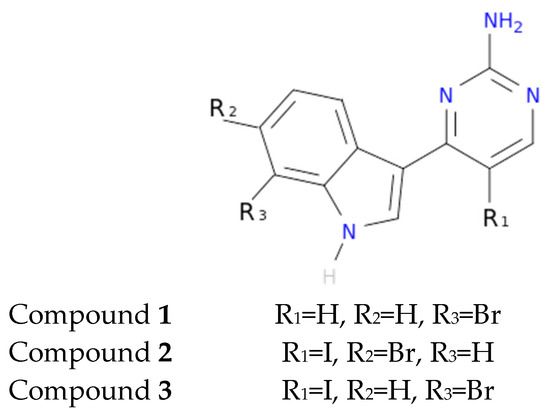 Another interesting feature observed with respect to the meridianin binding mode is the presence of bromine. When present, interaction energies seem to be higher. The perfect example is meridianin F, which has two Br at R2 and R3, and has the best interaction energies for each of the studied targets with respect to the rest of meridianins. Emphasizing this issue, a pattern was observed within the two classes of kinases. For CK1δ meridianins C (Br = R2), D (Br = R3) and F present the best interaction energies. In GSK3β, meridianins D and F are among the three best interacting compounds. On DYRK1A, meridianins B (Br = R3), C and F are three of the four best interacting compounds and in CLK1, meridianins B, C, D and F are the ones that show the best energies. All these facts led us to hypothesize that Br on R2 and R3 on meridianins could be synonymous with potency and has to be taken into account for the design of new lead compounds against tau and dual-specificity kinases, in particular, and protein kinases in general. Interestingly, the most promising meridianin-derived compounds already designed (by Bharate and co-workers and Giraud and co-workers), are bromine-iodo derivates (compounds 2 and 3) and noniodinated bromine analogues (compound 1) (Figure 9) [25,32]. This fact supports our hypothesis about the influence of Br in the potency of binding showed by meridianins. According to our binding results, the derived compounds do not interact with target kinases stronger than do the meridianins. Therefore, we hypothesized that to design more potent inhibitors, the presence of Br atoms is key, but it is not enough. Playing with the different orientations and binding residues implicated in the observed patterns in meridianins-kinase binding should be also taken into account.
