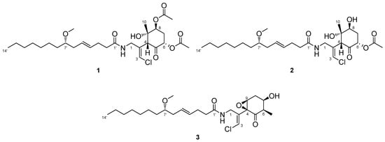 The ocean covers more than 70% of the Earth’s surface and hosts huge biological and chemical diversity. Because marine environmental conditions are quite different from terrestrial ones, natural products from marine organisms have unique structures and biological activities. Marine cyanobacteria, in particular, are known to produce various secondary metabolites and have been recognized as a source of pharmaceutical lead compounds [,,]. For example, bisebromoamide, isolated from Lyngbya sp., showed potent cytotoxicity against HeLa S3 cells []. Bisebromoamide inhibited the phosphorylation of extracellular signal-regulated protein kinase (ERK) and was identified as an actin filament stabilizer []. Meanwhile, hoshinolactam was found to possess both a cyclopropane ring and γ-lactam ring, and exhibited potent antitrypanosomal activity without cytotoxicity against human fetal lung fibroblast MRC-5 cells []. The malyngamide series of natural products have been isolated from various marine filamentous cyanobacteria. Malynagmide A, the first compound of this group, was isolated from Lyngbya majuscule in 1979 []; since then, over 30 malyngamide analogs have been isolated []. As part of our ongoing effort to identify novel bioactive natural products, we have focused on the constituents of marine cyanobacteria and isolated odoamide [,] and odobromoamide []. We recently discovered three new malyngamides, 6,8-di-O-acetylmalyngamide 2 (1), 6-O-acetylmalyngamide 2 (2), and N-demethyl-isomalyngamide I (3), from the Okinawan cyanobacterium belonging to the genus Moorea producens. (Figure 1). Herein, we report the isolation, structure determination, and biological evaluation of these compounds.