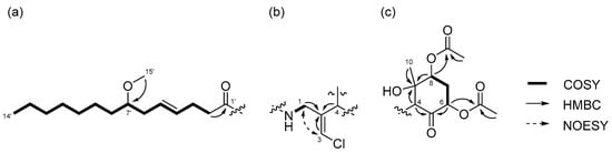 Partial structures of compound 1: (a) lyngbic acid moiety; (b) chloromethylene moity; (c) cyclohexanone ring moiety of 1. Wavy lines were used to indicate partial structures of 1.
