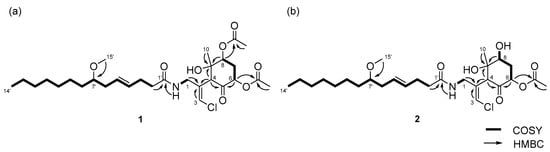 Compound 1 was obtained as a colorless oil. The molecular formula of 1 was determined to be C29H46ClNO8 on the basis of the 13C NMR spectrum (29 carbon signals, Figure S2) and high-resolution electrospray ionization mass spectrometry (HRESIMS) (m/z 572.2989 [M + H]+, calcd. 572.2985). The nuclear magnetic resonance (NMR) data for 1 are summarized in Table 1. These data indicated the presence of a secondary amide (δH 6.68, δC 173.8), disubstituted olefin (δH 5.45, 5.47, δC 128.3, 130.7), vinyl chloride (δH 6.29, δC 121.6) [], and O-methyl group (δH 3.31, δC 56.5), which are characteristic resonances of the malyngamide series [,,,]. A detailed 2D NMR analysis using COSY, HSQC, and HMBC data (Figures S3–S5) revealed the presence of 7-methoxytetradec-4(E)-enoic acid (lyngbic acid, Figure 2a). The E-geometry of the C-4’/C-5’ olefin was assigned based on the comparison of the 13C NMR chemical shifts of C-3’ (δC 28.7) and C-6’ (δC 36.3) with those of other known malyngamides [,,,].