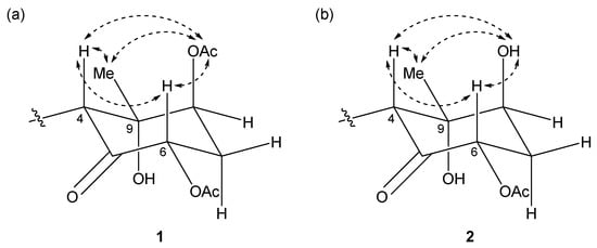 Key NOESY correlations for (a) compound 1 and (b) 2.