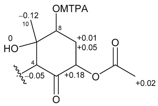 Δδ values (δS − δR) in ppm for the MTPA ester of 2.