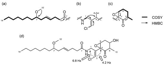 Compound 3 was obtained as a colorless oil. The molecular formula of 3 was determined to be C25H40ClNO5 on the basis of the 13C NMR spectrum (25 carbon signals, Figure S14) and HRESIMS (m/z 460.2692 [M + H]+, calcd. 470.2668). The NMR data for 3 are summarized in Table 2. The 1D and 2D NMR spectra of 3 revealed that it had a lyngbic acid moiety (Figure 6a), like compound 1 and 2. The structure of the remaining C10H13ClNO3 unit was determined as follows. COSY correlation between H-1/NH and HMBC correlations between H-1/C-2, H-1/C-4, and H-3/C-2 led to the partial structure C-1 to C-4 containing a chloromethylene moiety (Figure 6b). Because the geometry of the vinyl chloride could not be determined by NOESY experiments, we conducted HSQMBC NMR experiments []. We observed a 6.8 Hz 3J coupling from H-3 to C-1 and 4.2 Hz 3J coupling from H-3 to C-4. These coupling constants and comparison with the reported results for malyngamide R [] revealed the E geometry of this double bond. Additionally, COSY correlations between H-10/H-6, H-6/H-7, H-7/H-8, and H-8/H-9, and HMBC correlations between H-6/C-5 and H-9/C-4 led to the partial structure from C-5 to C-4 (Figure 6c). The chemical shifts of H-7 (δH 3.81) and C-7 (δC 68.7) were consistent with the presence of a hydroxy group at C-7. The remaining component and the high-field chemical shifts of C-4 and C-9 (δC 61.4 and 62.1, respectively) indicated the presence of an epoxy group at C-4 and C-9 [,]. Although HMBC correlations between H-6/C-5 and H-9/C-5 were not observed, C-4 and C-5 should be connected considering the degree of unsaturation of 3. Thus, it became apparent that compound 3 had a cyclohexanone ring, and the gross structure of 3 was determined to be that displayed in Figure 6d.