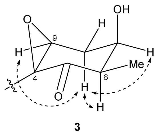 The relative structure of the cyclohexanone ring in 3 was determined by a NOESY experiment. The NOESY spectrum of 3 (Figure S18) indicated that H-6 and H-8b were in axial positions of the ring. The coupling constant of H-9 (2.6 Hz) and NOESY correlations between H-8b/H-7 and H-8b/H-9 indicated that H-7 and H-9 were in equatorial positions of the ring. Therefore, the relative configuration of the ring moiety in 3 was deduced to be 4S*, 6R*, 7R*, and 9S* (Figure 7).