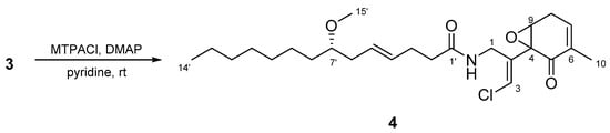 To determine the absolute configuration of C-7, 3 was treated with MTPACl. However, the MTPA ester of 3 was not obtained; compound 4 was obtained instead (Figure 8). Accordingly, the absolute stereochemistry of the cyclohexanone ring in 3 was not determined. The absolute configuration of C-7’ was established to be S using the same method as described above for 2.